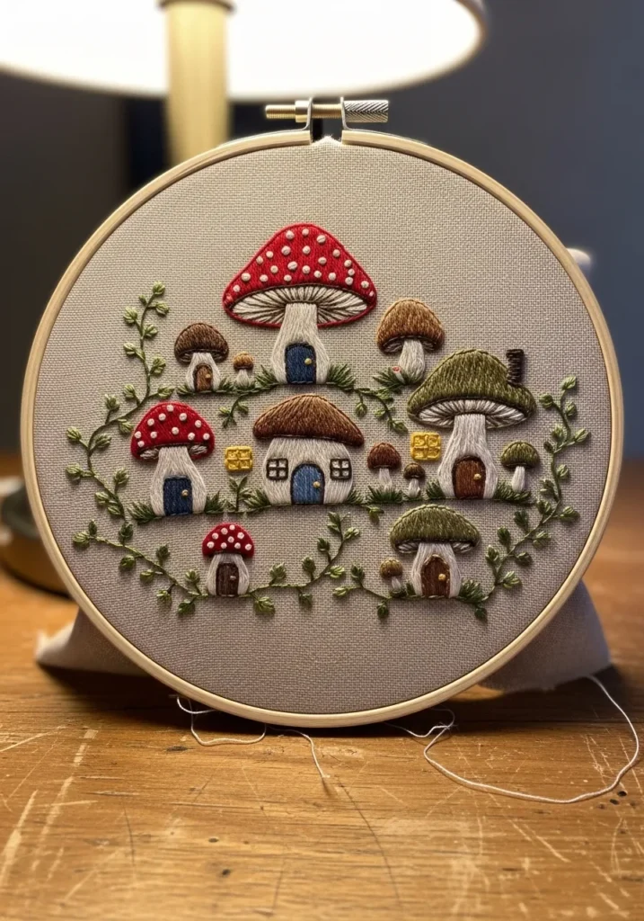 This playful embroidery hoop displays a tiny mushroom village with red capped toadstools and little stitched houses nestled among greenery. The caps are dotted with small white details, and the stems are shaded for a soft rounded look. Delicate vines and miniature flowers frame the scene against the neutral fabric.