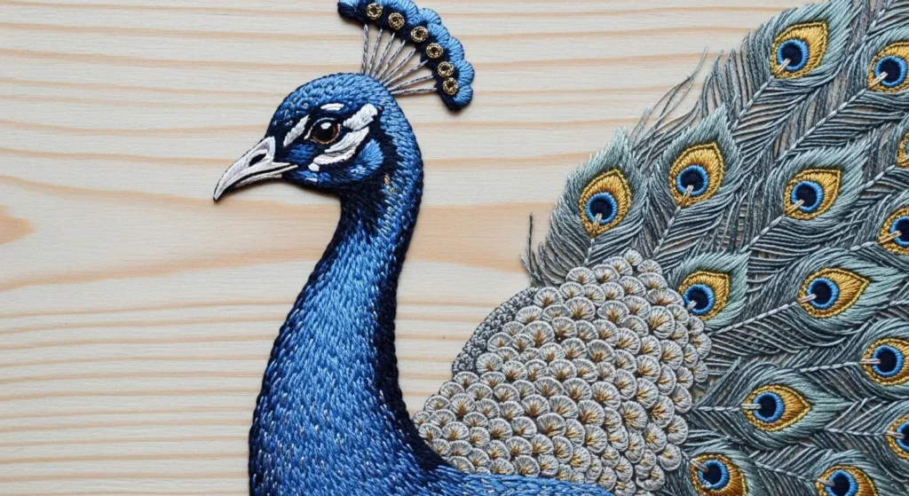 This embroidery highlights a majestic peacock head with layers of deep blue stitching and intricate feather details extending outward. Each feather eye is carefully outlined in gold and teal tones, creating a rich textured effect. The fine line work around the face gives the bird a regal and lifelike presence against the soft fabric background.