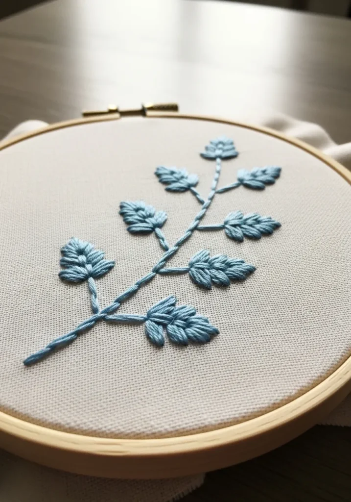 This elegant hoop features a light blue leafy branch stitched with stem stitch outlines and small textured leaves. The flowing line of the branch gives the design movement, while the simple stitch work keeps it beginner friendly. The soft blue thread contrasts gently with the natural linen.