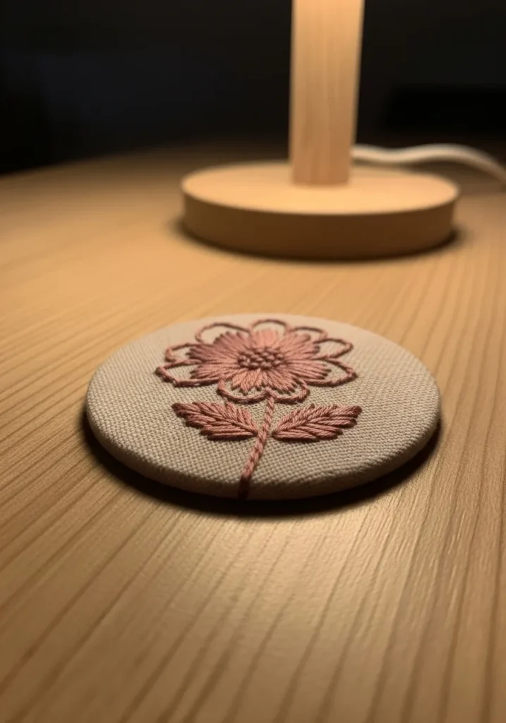 This sweet little round fabric medallion features a delicate floral design stitched in dusty blush pink thread on natural linen. The petals are outlined with a neat back stitch, then softly filled with satin stitch for a smooth, slightly raised finish. The center has subtle textured stitches that add depth, while the leaves are worked in angled straight stitches that give them a feathery look. The circular shape feels polished and compact, almost like a tiny embroidered badge resting on the wooden surface.