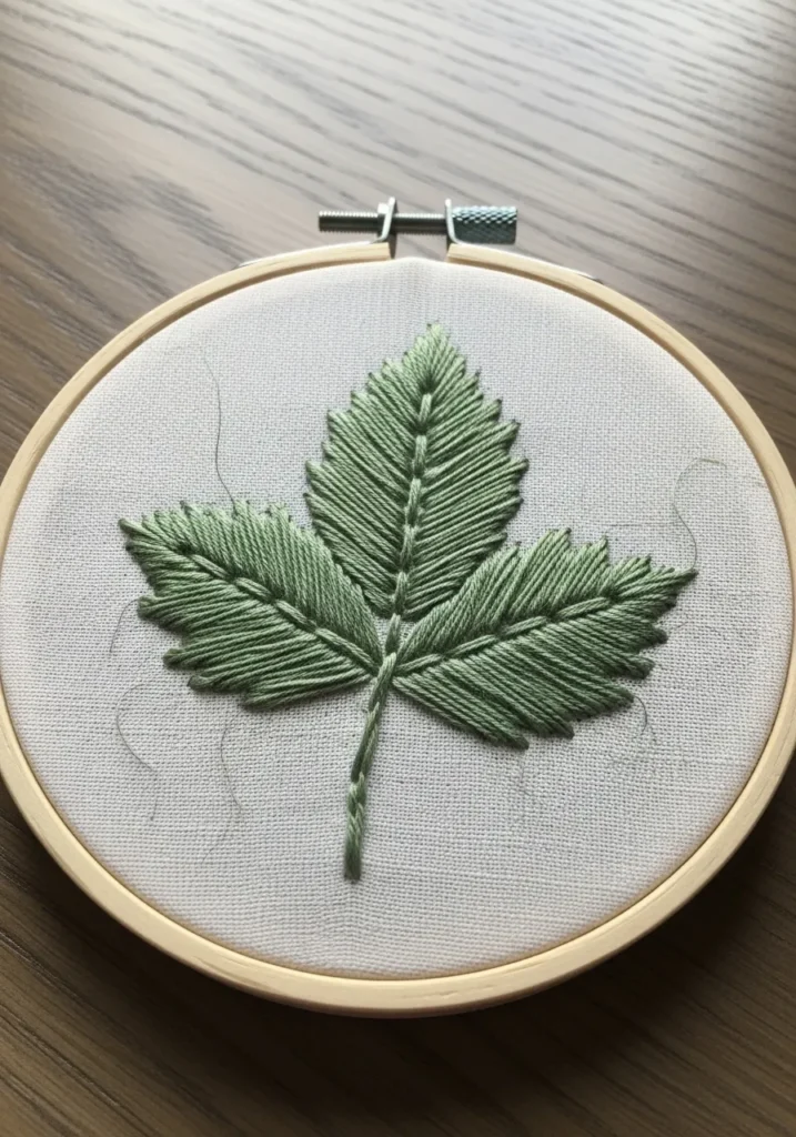 This embroidery hoop features a beautifully detailed leaf stitched in layered shades of soft green floss on natural linen. The veins are outlined delicately, and the interior is filled with smooth satin stitches that follow the direction of the leaf shape, giving it a realistic texture and subtle dimension. The wooden hoop frames the design neatly, and the neutral fabric lets the green tones feel fresh and calming.