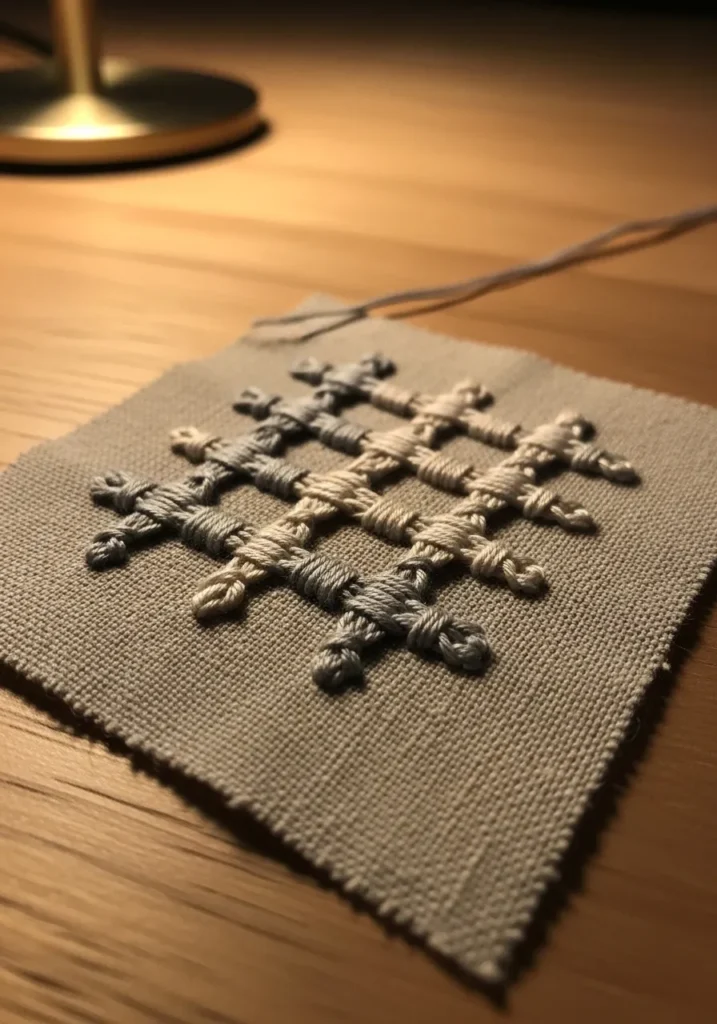 This square of linen showcases a bold grid pattern created with evenly spaced straight stitches layered in a crisscross formation. The thread is a soft gray tone that adds texture without overpowering the neutral background. The overlapping stitches create a raised lattice effect that feels structured and modern.