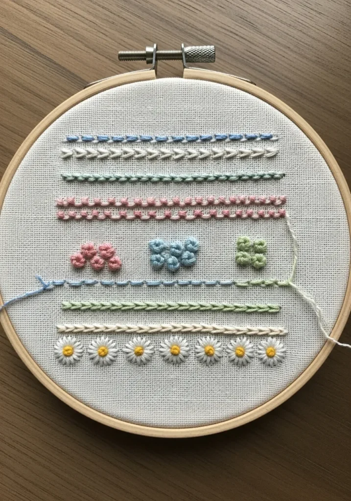 This round embroidery hoop displays multiple rows of basic stitches in soft pastel threads, including running stitch, chain stitch, French knots, and small floral details. Each row is neatly organized, showing different textures and patterns across the neutral fabric. The mix of pinks, blues, and greens gives it a cheerful and inviting feel.