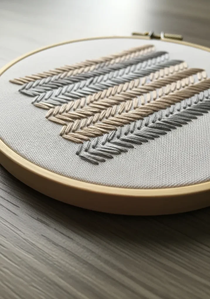 This embroidery hoop showcases several parallel rows of feather stitch worked in soft beige and taupe threads. The stitches branch out gently from a central line, creating a leaf like pattern that feels organic and textured. The neutral palette gives it a calm, Scandinavian inspired vibe while letting the stitch structure take center stage.