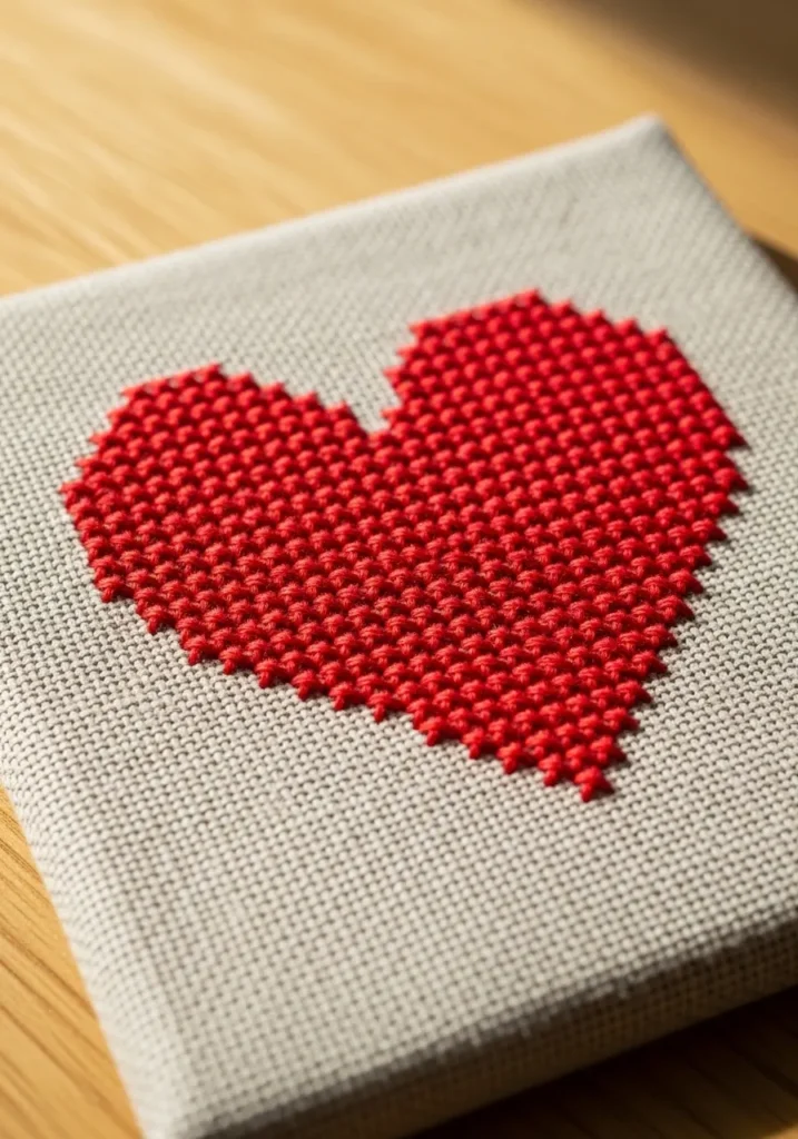 This vibrant heart is filled with tight, closely packed red stitches on a square piece of light linen. The texture is rich and slightly raised, giving the heart a plush appearance against the neutral background. The clean edges of the shape show careful stitch placement.