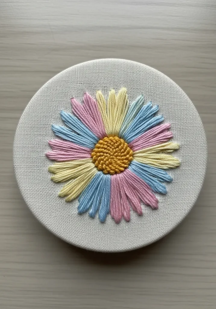 This circular hoop features a daisy design with satin stitch petals in soft pink, yellow, and blue threads. The petals are long and smooth, radiating around a textured yellow center that adds contrast. The pastel palette feels sweet and fresh against the natural fabric.