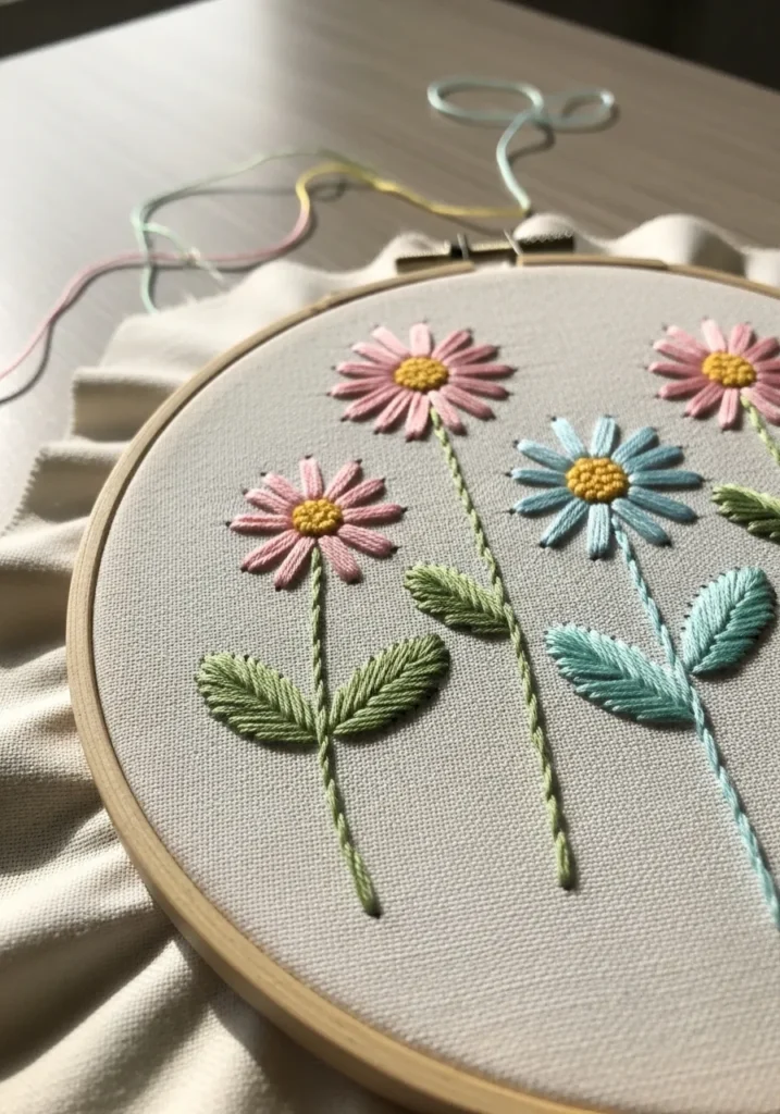I love this kind of floral pattern for practice because it lets me work on basic stitches without feeling overwhelmed. The simple outlines guide the shapes, and filling in the petals is such a relaxing way to build confidence. It feels playful and fresh, like doodling flowers in the margins of a notebook but way prettier.