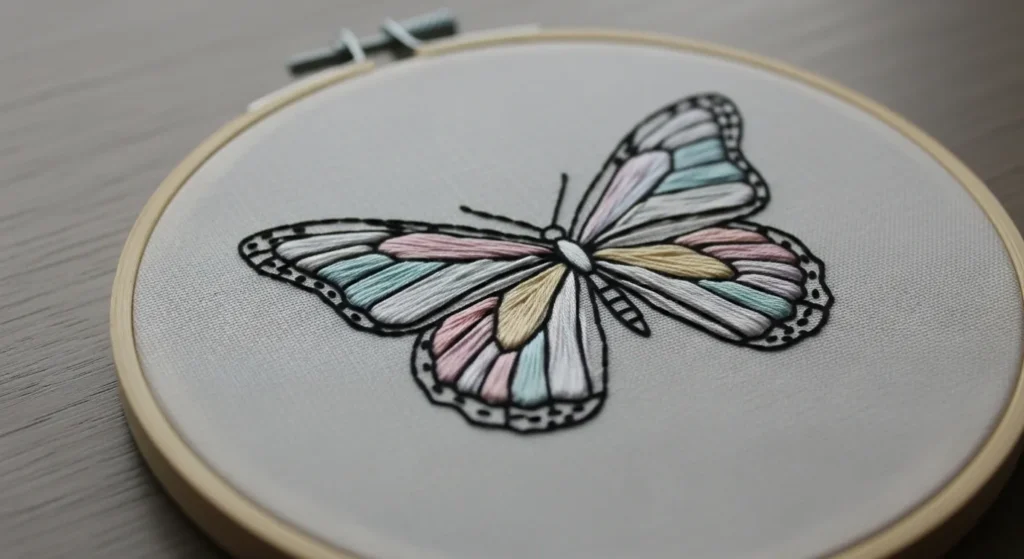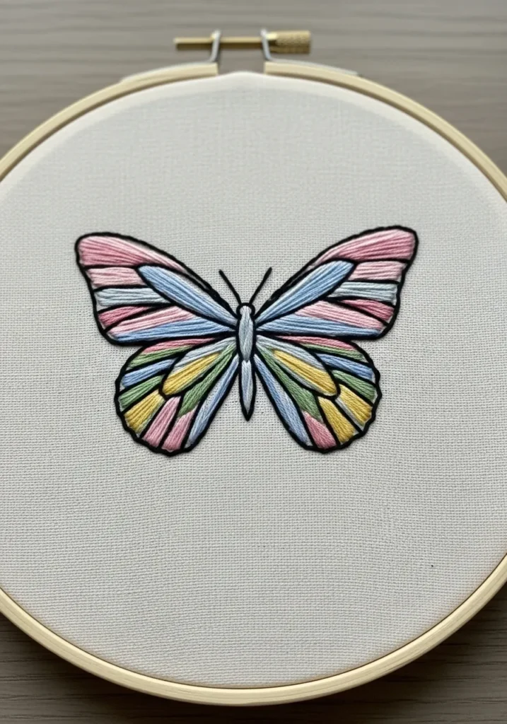 This butterfly design features clean black outlines with pastel pink, blue, and yellow sections filled in neatly on white fabric. The symmetry of the wings makes it visually striking, and the soft color palette keeps it gentle and charming. The light wooden hoop frames the design beautifully.