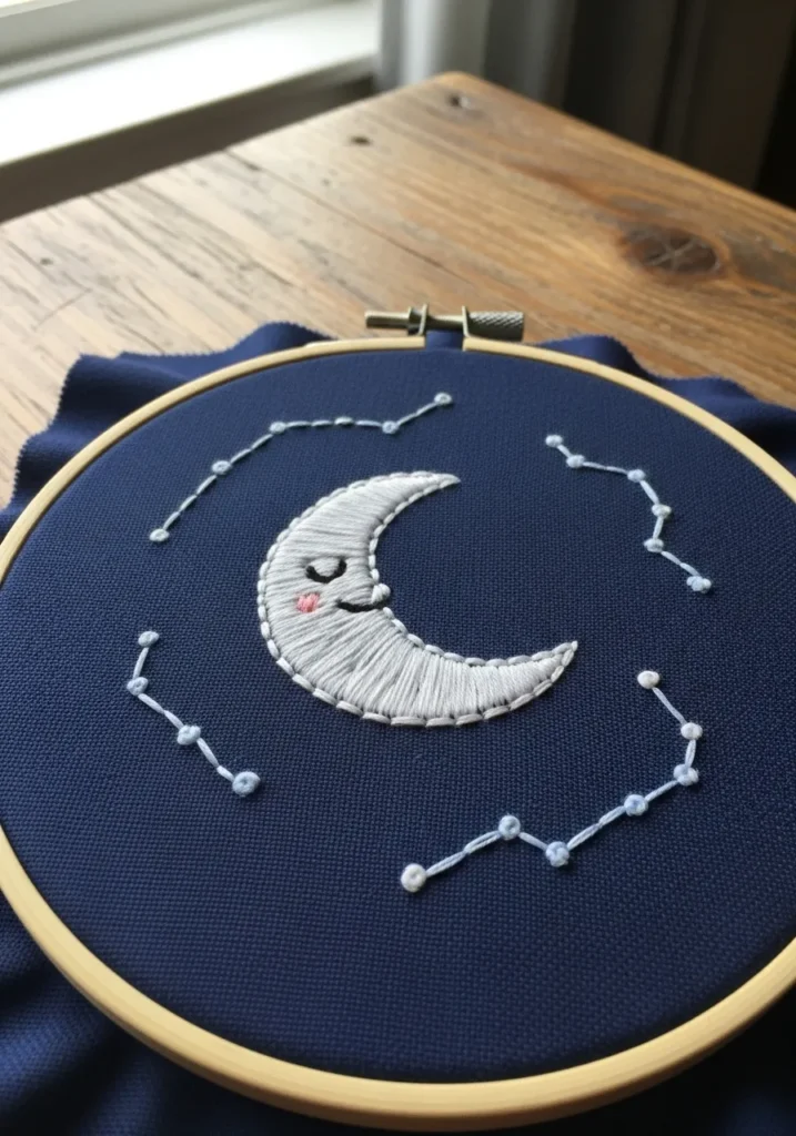I think celestial patterns are such a relaxing choice when practicing embroidery. The curved shape of the moon helps with smooth stitching, and the tiny stars are great for working on small details. It feels peaceful and magical without being complicated.