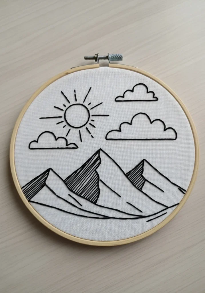 This clean and modern hoop features simple black stitched outlines of mountains, a bright sun, and a few fluffy clouds. The design is mostly line work on light fabric, giving it a crisp sketchbook look. The straight lines of the peaks contrast nicely with the soft curves of the clouds and sun.
