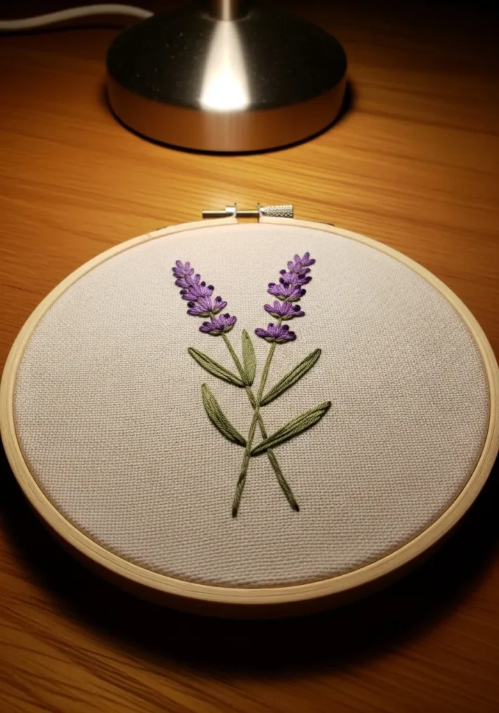 This delicate embroidery hoop displays a single lavender stem stitched in soft purple and green threads. The tiny buds are made with small textured stitches, while the slim green stem keeps the design airy and minimal. The neutral fabric background lets the gentle colors shine.