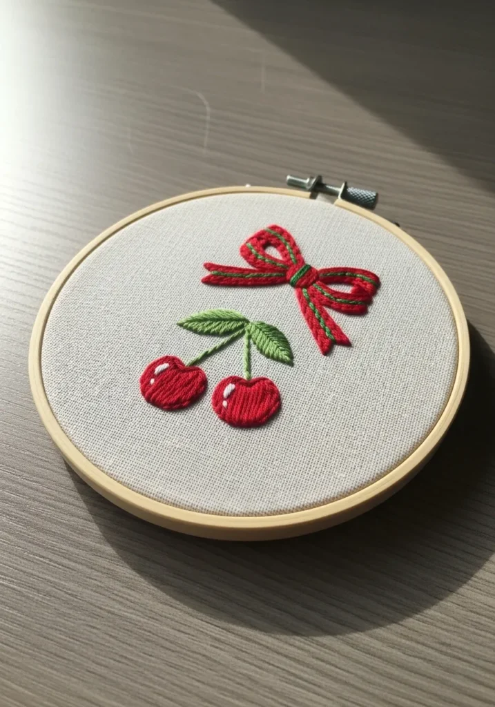This sweet little hoop shows two bright red cherries tied together with a bold red bow, stitched on neutral fabric. The cherries are filled with rich satin stitches that give them a glossy look, while the green stems and leaves add a pop of contrast. The clean black outline keeps everything looking like a simple drawing, which makes the design stand out beautifully against the plain background.