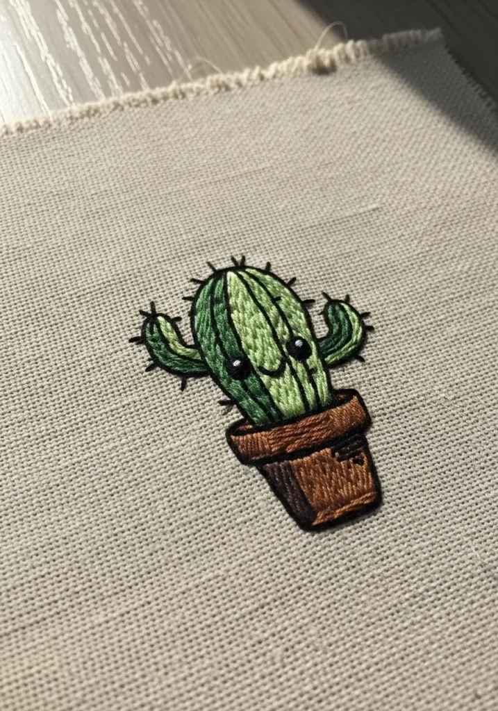 This adorable embroidery design features a tiny cactus stitched in rich green threads, sitting in a warm brown flower pot on neutral fabric. The cactus has simple black outline details and tiny stitched spikes that give it a playful, hand drawn look. The pot is filled with smooth satin stitches that add texture and depth, while the soft fabric background keeps everything clean and minimal. The whole piece feels like a sweet little sketch brought to life with thread.