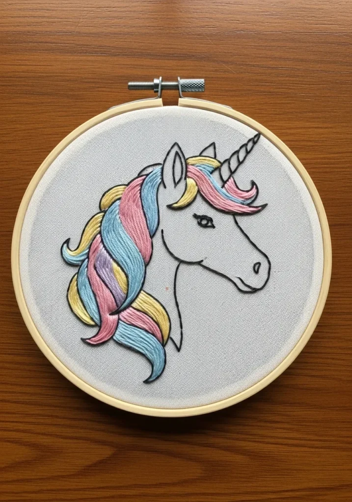 This embroidery hoop features a dreamy unicorn head with flowing pastel mane in shades of pink, blue, yellow, and lavender. The outline is stitched in clean dark thread, giving it that hand drawn coloring book vibe. The mane sections are softly filled, creating a layered texture that feels gentle and whimsical. The white fabric background keeps the focus on the playful character.
