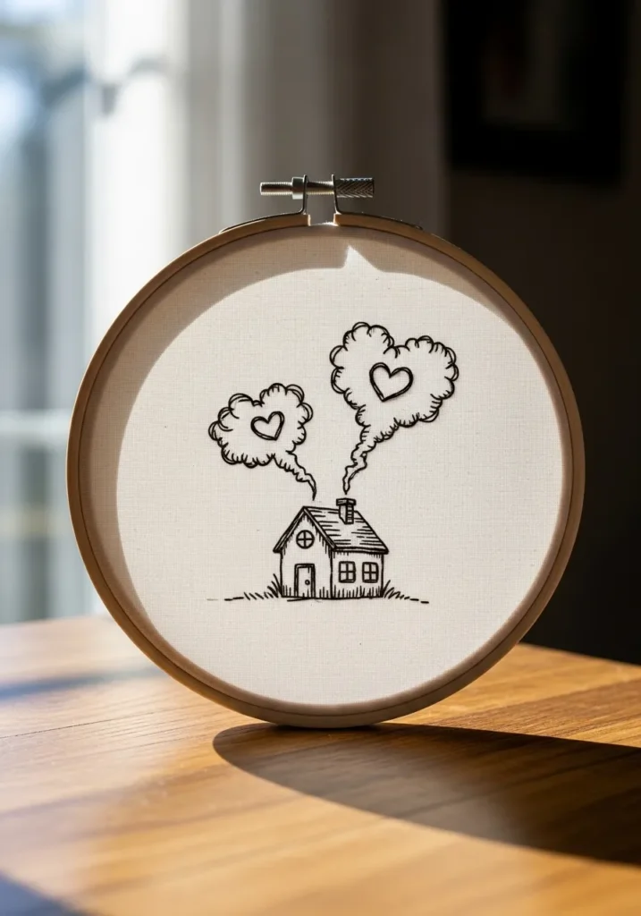 This charming hoop shows a tiny house stitched in clean black line work with two heart shaped puffs of smoke floating above the chimney. The design is simple and mostly outlined, giving it a sketch style look on plain fabric. The wooden hoop frames it neatly, and the minimal stitching creates a sweet, airy feel.