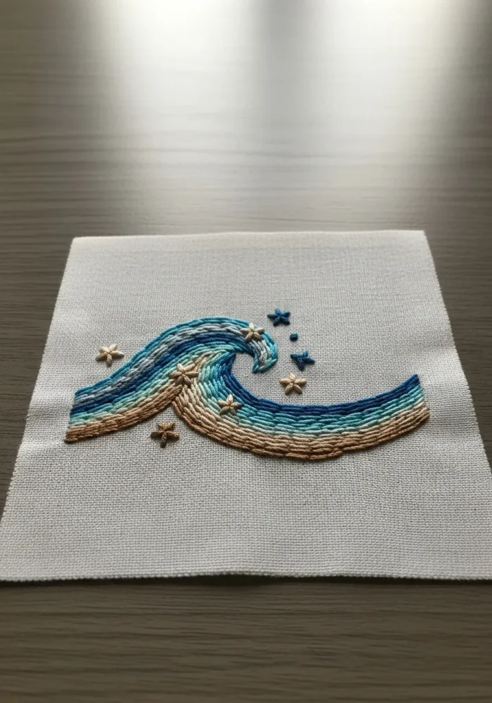 This embroidery piece features a curling blue wave stitched with layered shades of navy, sky blue, and sandy beige along the base. Tiny starfish details add a whimsical touch. The flowing lines of thread mimic a hand drawn sketch, but the different stitch directions give the water beautiful texture and movement.