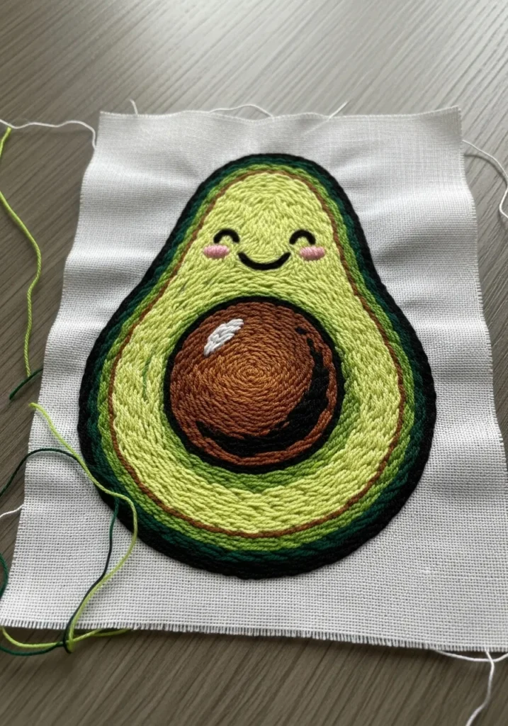 I have such a soft spot for food inspired designs like this. They are easy to draw, easy to stitch, and full of personality. Practicing curved satin stitches on the avocado shape is surprisingly satisfying, and the cute face makes the whole project feel lighthearted.