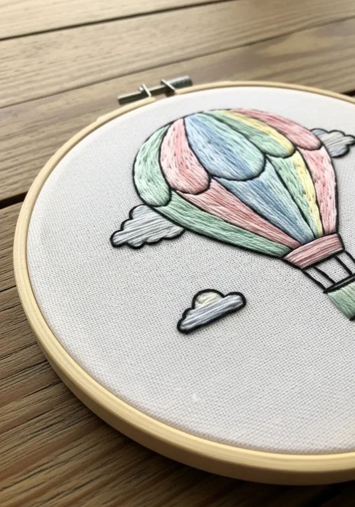 This hoop showcases a whimsical hot air balloon with pastel panels in pink, mint, yellow, and blue. The clean outline keeps the design structured, while the soft fill stitches add gentle texture. Small cloud details near the balloon give it a dreamy, floating feel.
