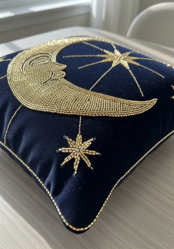 This deep navy velvet pillow is pure nighttime glamour with its sweeping gold crescent moon and radiant starburst embroidery stitched in metallic thread and dense beadwork. The crescent curves elegantly across the corner, filled with tiny shimmering beads that catch the light, while scattered stars add balance and sparkle. The velvet texture looks plush and rich, and the raised embellishment gives it that dramatic designer finish that feels both luxurious and dreamy.