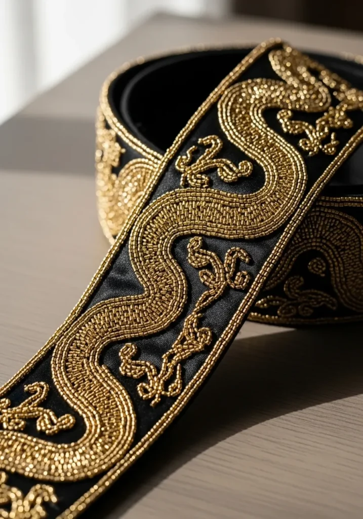 This bold black fabric belt features ornate gold dragon embroidery that winds along its length in intricate detail. The metallic thread creates a rich contrast against the dark base, and the swirling shapes give it movement and drama. The embellishment feels regal and powerful, almost like something from a couture runway.