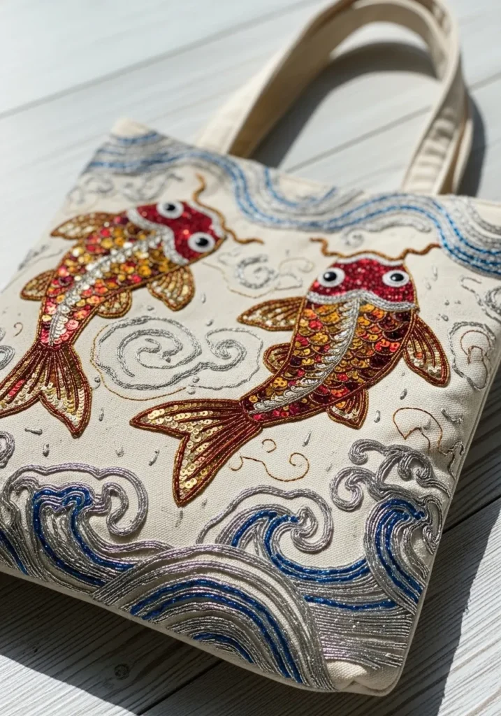 I love when everyday items like tote bags get this kind of attention to detail. It makes running errands feel a little more stylish. Plus, the koi theme adds symbolism and story, which always makes a handmade piece feel extra special.