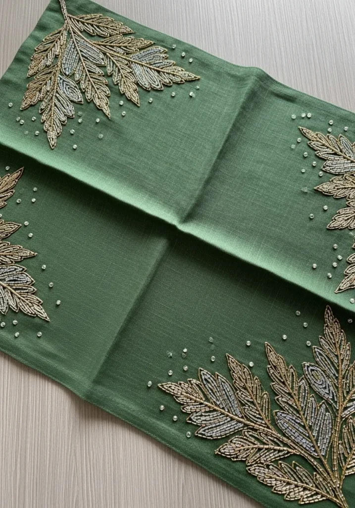 This sage green fabric placemat is beautifully embellished with metallic gold leaf embroidery stretching along both ends. The leaves are stitched with fine thread and tiny bead accents that add a subtle shimmer against the matte fabric. The design feels organic yet refined, with delicate veins and layered stitching that give each leaf dimension and texture.