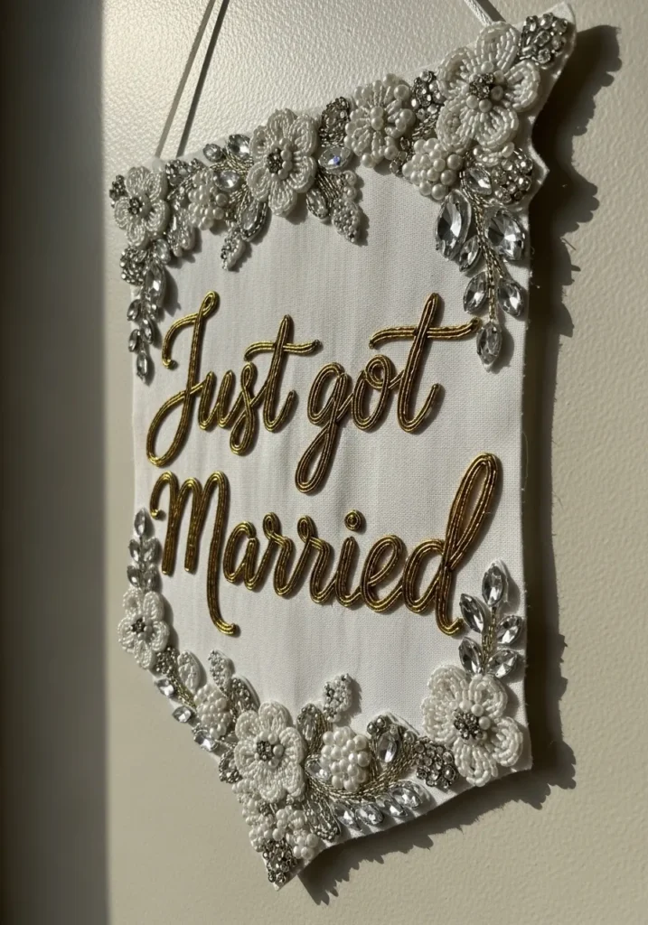 This ivory fabric banner features bold gold script reading just got married, framed by ornate beaded floral appliqués around the edges. The lettering is done in metallic thread that catches the light, while clusters of pearls and crystals form a romantic border. The soft fabric base keeps it elegant and wedding ready without feeling over the top.