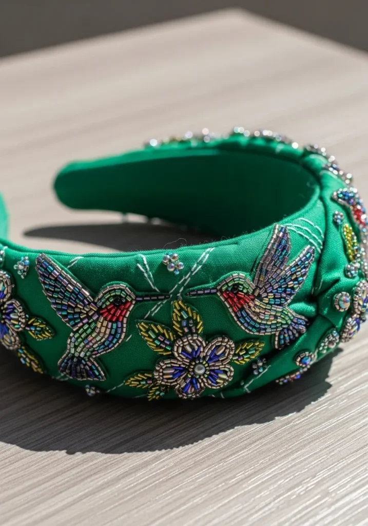 This vibrant green fabric headband is decorated with intricate hummingbird embroidery surrounded by tiny beaded flowers. The birds are stitched in jewel toned threads that pop against the bold green base, and the bead accents add sparkle without overwhelming the design. The fabric structure keeps it polished while the embellishment makes it playful.