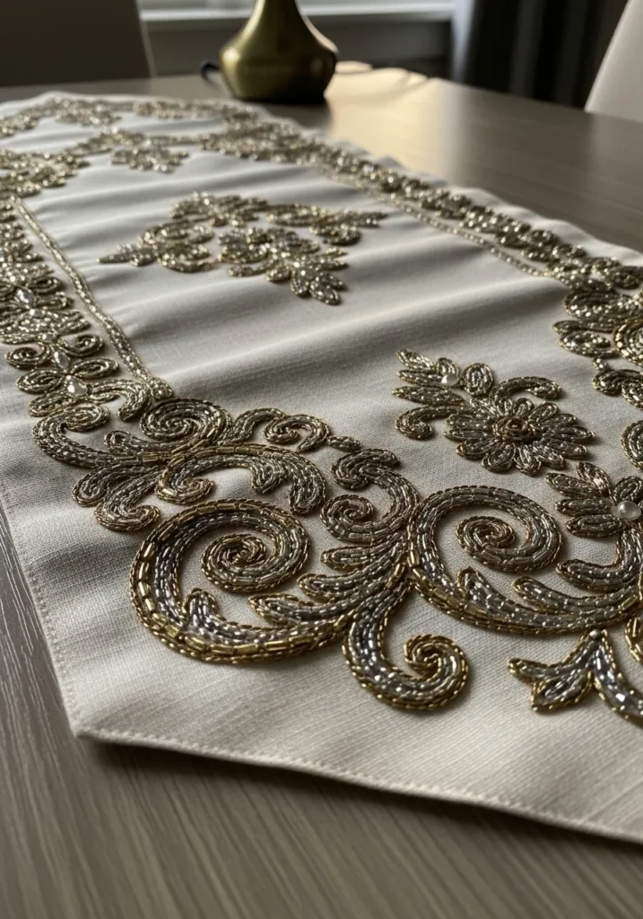 This cream fabric tablecloth features elaborate baroque style embroidery in metallic gold thread swirling across the surface. The scrolling patterns are highlighted with subtle bead accents that give the design depth and dimension. The neutral base keeps it elegant, while the detailed stitching adds that unmistakable designer finish.