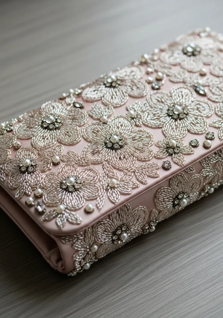 This blush pink fabric clutch is covered in intricate floral beadwork made from pearls, crystals, and tiny sequins. The flowers bloom across the surface in soft ivory and champagne tones, creating a textured garden effect. The structured shape balances the romantic embellishment perfectly.