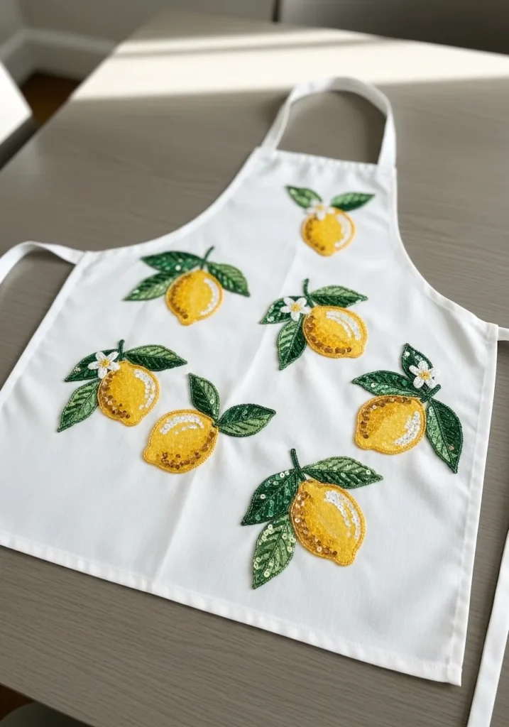This crisp white fabric apron features vibrant embroidered lemons hanging from leafy green branches, accented with subtle bead details that add dimension to each fruit. The bright yellow thread pops beautifully against the clean white base, and the glossy stitched leaves give it a fresh Mediterranean feel. The embellishment is playful yet polished, making the apron look more like wearable art than everyday kitchen gear.