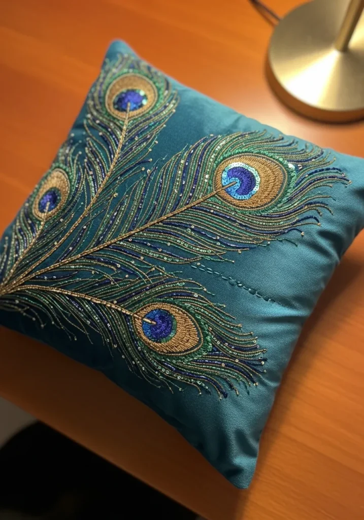 Peacock Feather Embroidered Cushion