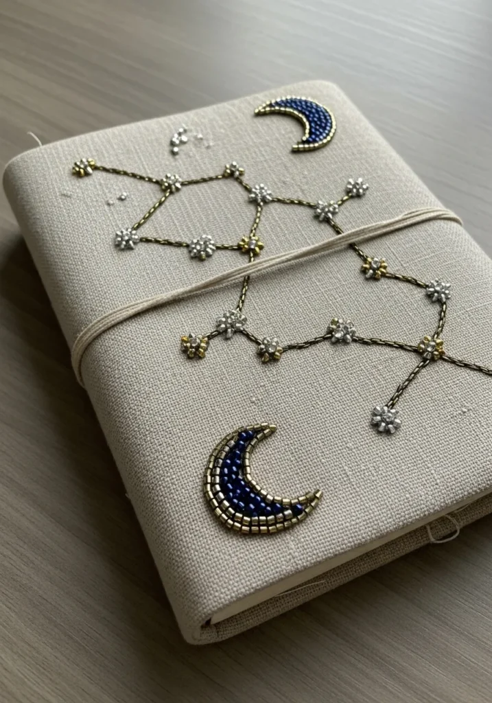 This soft neutral fabric journal cover is decorated with delicate beaded constellations and a crescent moon stitched in metallic thread. Tiny beads mark the stars, connected by fine embroidered lines that map out the night sky in a subtle and sophisticated way. The fabric base keeps it understated while the embellishments add just enough sparkle to feel special.