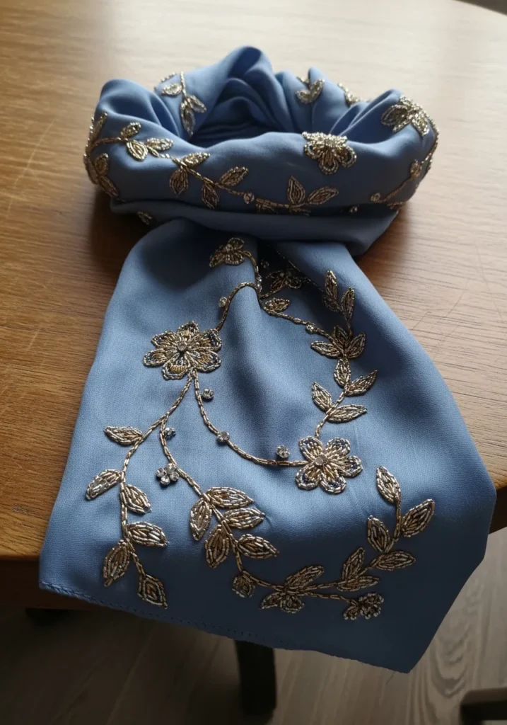 This soft blue silk scarf is embellished with intricate metallic thread embroidery forming delicate floral branches across the fabric. The gold stitching contrasts beautifully against the cool blue base, and small bead accents add a hint of shimmer without overpowering the design. The flowy fabric gives the embellishment a graceful movement that feels very high end.