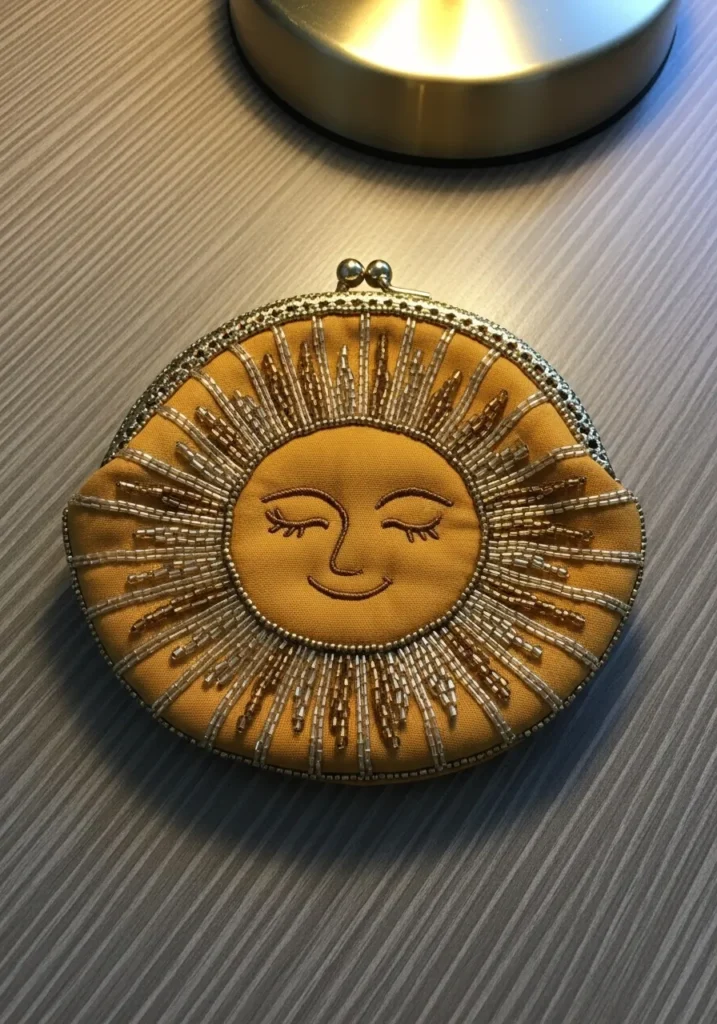 This round fabric pouch showcases a radiant sun face design stitched in warm golden and amber threads. The smiling sun is outlined with intricate embroidery and subtle bead accents that highlight its rays. The warm tones give it a cozy glow, and the detailed stitching makes it feel charming and artistic rather than cartoonish.
