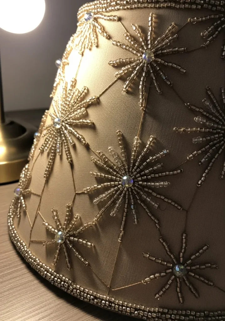 This neutral fabric lampshade is adorned with symmetrical starburst patterns stitched in metallic thread and dotted with tiny beads. The embellishments radiate outward in delicate lines, creating a subtle sparkle when the light shines through. The soft beige fabric balances the shimmer so it feels sophisticated instead of flashy.