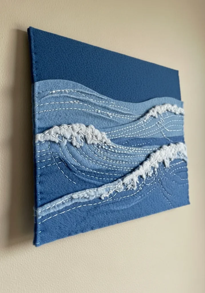 I love how soothing this piece feels the moment you look at it. If you are into coastal decor or calming color palettes, this is such a satisfying project to try. Cutting the curved wave layers is easier than it looks, and stitching the flowing lines feels almost like sketching with thread. It is creative without being complicated, and the end result brings a peaceful seaside vibe right into your home.