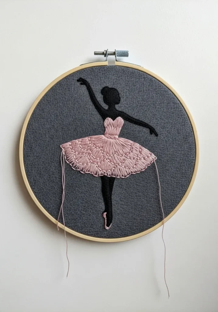 This graceful felt embroidery hoop features a striking ballerina silhouette set against a soft gray felt background. The dancer’s body is crafted from smooth black felt, creating a bold contrast that instantly draws the eye. Her tutu is beautifully stitched in blush pink thread, with layered embroidery forming delicate scalloped textures that mimic flowing fabric. Fine stitch lines radiate outward to give the skirt movement and depth, while the wooden hoop frames the design in a simple and classic way. The combination of flat felt shapes and detailed threadwork gives the piece a lovely balance of softness and elegance.