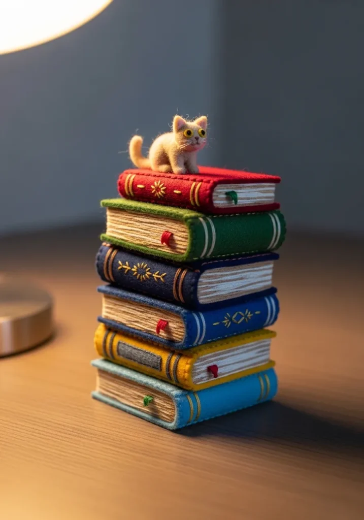 I am completely in love with how creative this idea is. If you adore cozy reading corners or anything book themed, this is such a fun project to bring to life. Making each tiny book feel unique is where the magic happens, and adding that little kitten on top just makes it extra adorable. It feels like building a miniature world out of felt and thread, and the final result is both elegant and delightfully quirky.