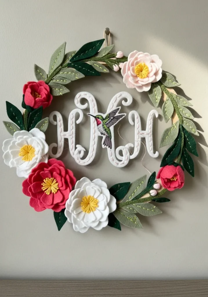 Floral Monogram Wreath With Hummingbird Felt Embroidery