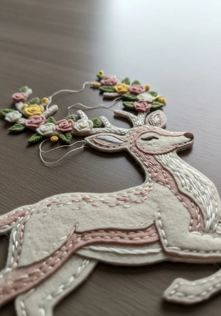 I am completely charmed by how magical this design feels. If you love woodland themes with a feminine twist, this is such a sweet project to try. The deer silhouette is simple enough to cut from felt, and adding the stitched details makes it feel extra special without being overwhelming. Decorating the antlers with little flowers is honestly the best part. It feels like building your own fairy tale scene with needle and thread, and the finished piece looks beautiful in a bedroom or cozy reading nook.