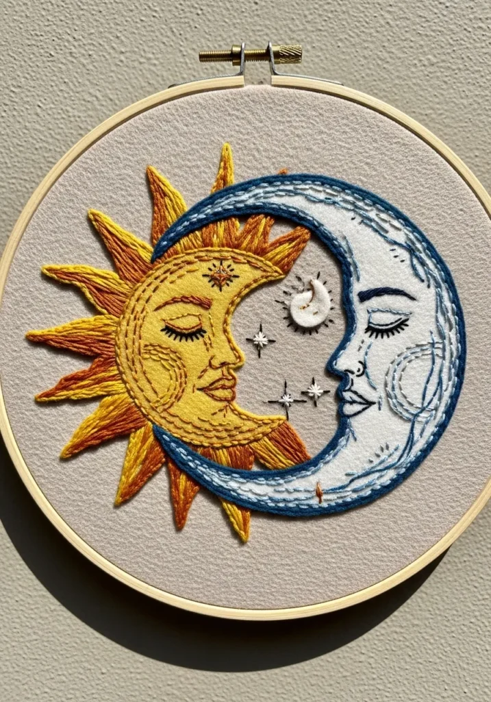 Celestial Sun and Moon Felt Embroidery Hoop