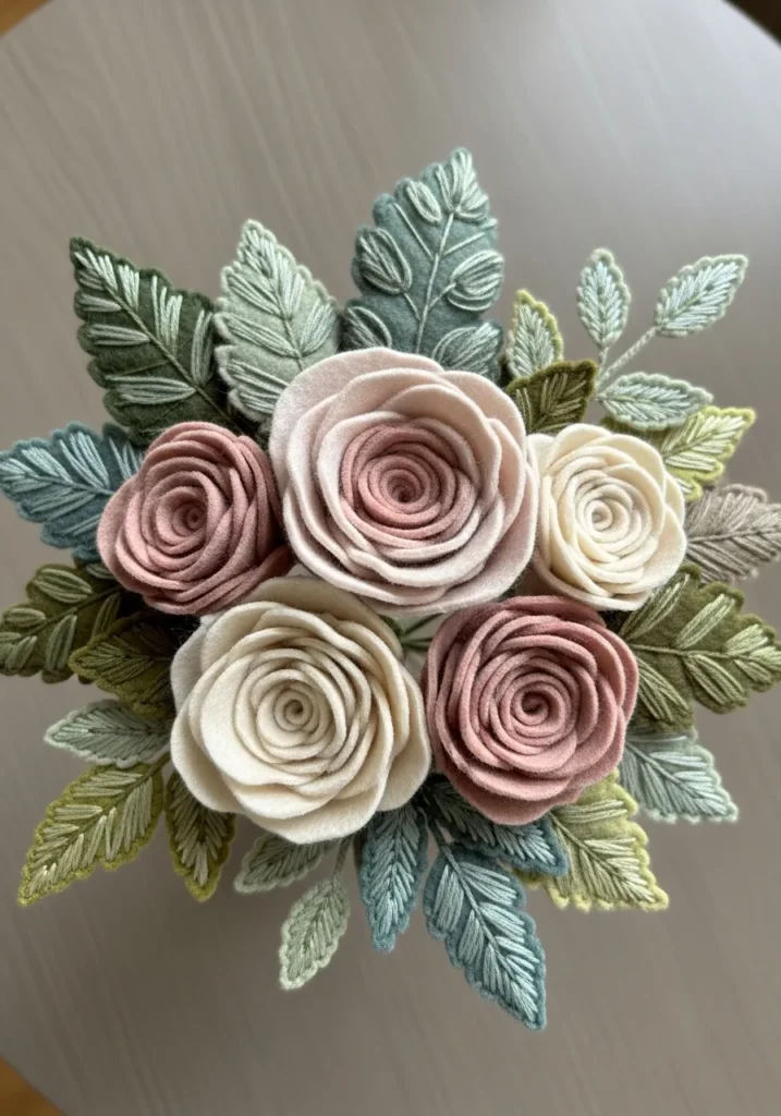 This elegant felt embroidery piece features a stunning bouquet of layered felt roses in soft blush, dusty rose, and creamy ivory tones. Each flower is carefully rolled and shaped to create full, dimensional blooms with a plush texture that almost looks real. Surrounding the roses are beautifully embroidered felt leaves in muted sage, eucalyptus, and olive shades, stitched with fine vein details that add depth and softness. The combination of raised felt petals and delicate threadwork gives the whole arrangement a rich, romantic look while still feeling cozy and handmade.