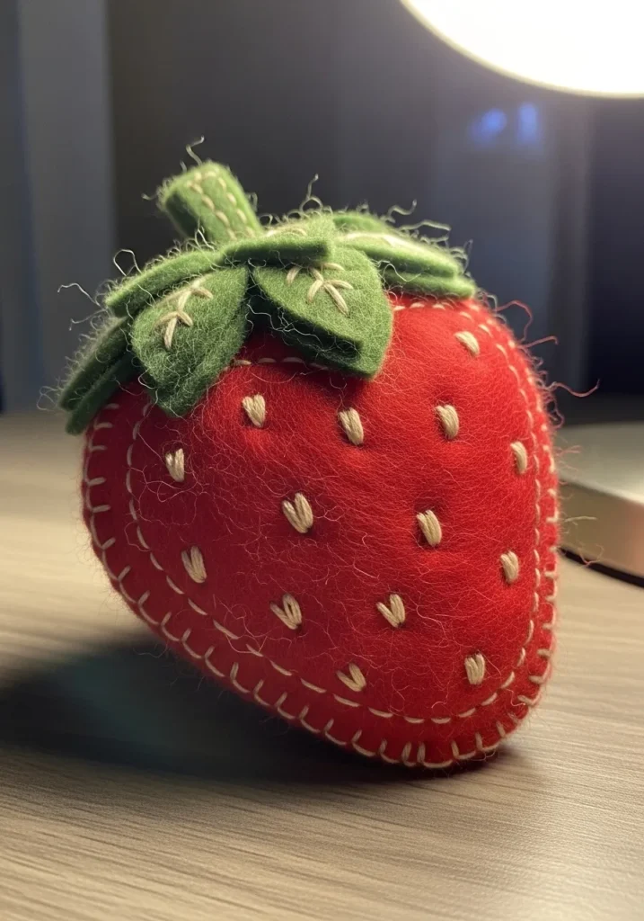 I honestly think fruit inspired projects like this are such a joy to make. If you love playful decor with a soft texture, this strawberry is a perfect little weekend craft. The shape is simple to cut, and stitching the seeds is oddly relaxing and satisfying. It feels like creating a tiny piece of fabric candy that never goes bad. I would happily place this on a shelf, gift it to a friend, or even turn it into a cute decorative accent for a craft room.