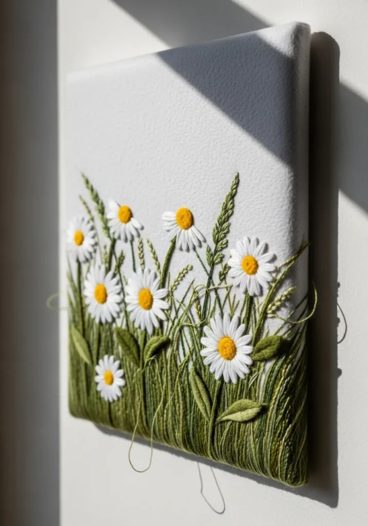 I am completely in love with how fresh and calming this design feels. If you adore floral decor but want something light and airy, this is such a lovely project to try. Stitching the grass is surprisingly soothing, and layering the daisy petals feels like building a tiny garden by hand. It is one of those crafts that looks detailed and impressive, yet the shapes are simple and beginner friendly. I would happily hang this in a craft room or bedroom for an instant touch of spring all year long.