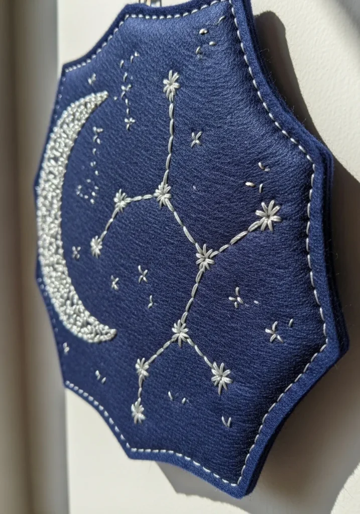 This elegant felt embroidery piece features a rich navy blue felt base shaped into a soft star silhouette, giving it a dreamy celestial feel right away. A crescent moon in textured white stitching sits along one side, while delicate embroidered constellations stretch across the center in fine white thread. Each tiny star is stitched with careful detail, creating a subtle raised texture that contrasts beautifully against the deep blue felt. The edges are neatly hand stitched in white, framing the design and adding to that cozy handmade charm.