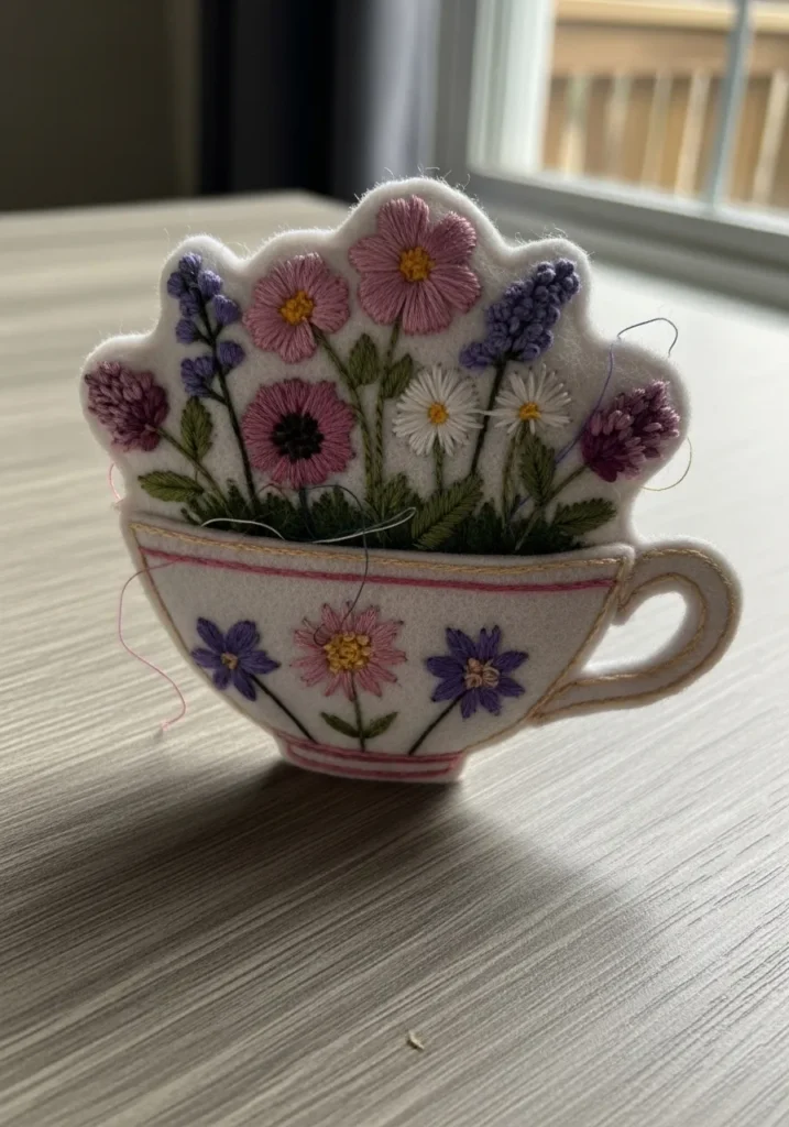 Whimsical Teacup Garden Felt Embroidery