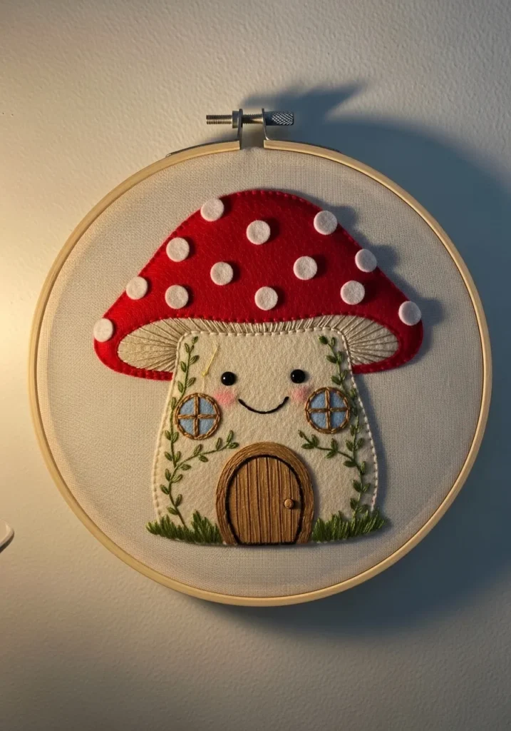 This adorable felt embroidery hoop features a storybook mushroom cottage brought to life with layered felt and delicate stitching. The bright red mushroom cap is topped with soft white felt dots, giving it that classic fairy tale charm. The cottage base is made from creamy felt, embroidered with tiny leafy vines that frame two round stitched windows. A textured wooden style door with stitched grain detail adds warmth and personality, while little touches of green thread create grassy accents at the bottom. Everything sits neatly inside a wooden hoop against a neutral fabric background, which makes the colors pop beautifully.