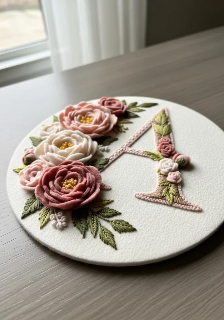 This elegant felt embroidery piece features a beautifully stitched letter A surrounded by lush layered felt flowers. The base is a soft ivory felt circle that keeps the design clean and refined. Blush, dusty rose, and creamy white felt blooms are carefully shaped into full dimensional roses, each with delicate embroidered centers in warm yellow thread. Fine green embroidery forms leafy accents and tiny sprigs that wrap gently around the monogram. The letter itself is outlined with neat stitching in a soft pink tone, which ties the whole palette together and gives it that romantic handmade charm.