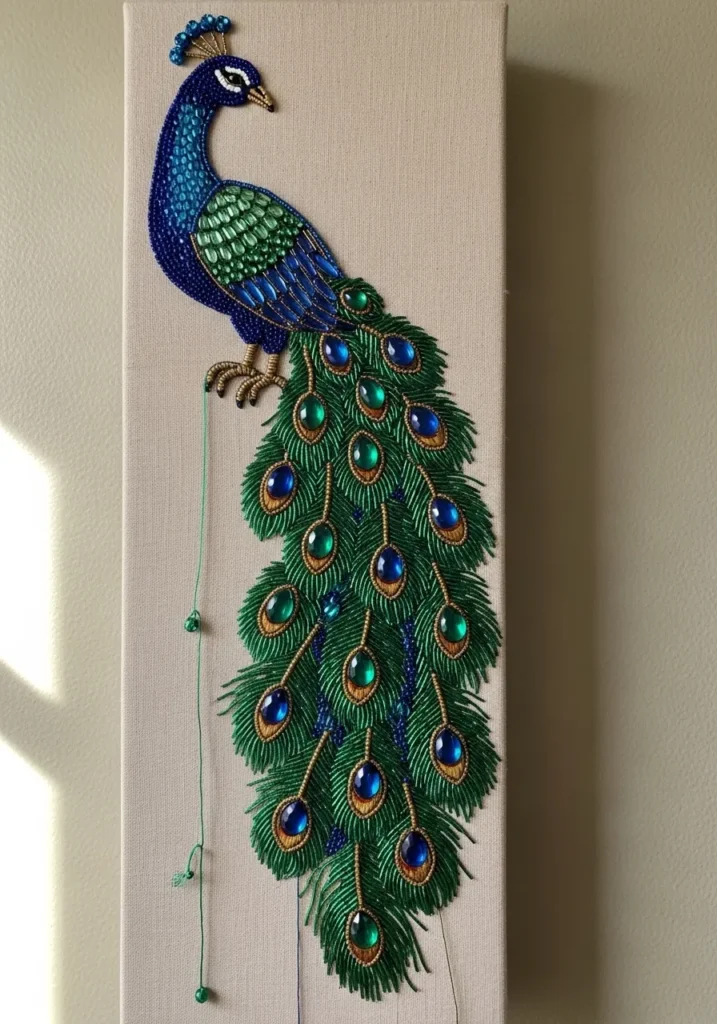 • Regal Peacock Hand Beaded Fabric Wall Art
